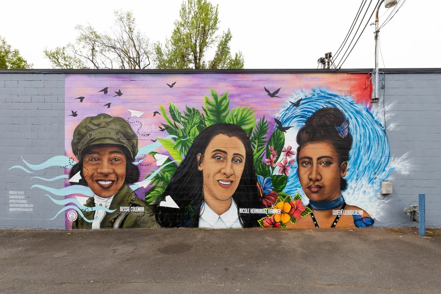 Take a drive down N Tryon St and view this stunning mural by Kalin Devone. Commissioned through ArtPop’s Inspiration Projects division in collaboration with Harris Teeter, Procter & Gamble, this mural celebrates Women’s History Month. The mural honors American aviator Bessie Coleman, Guatemalan-American scientist Nicole Hernandez Hammer, and Queen Liliʻuokalani, themed around "air, land, and sea." Kalin is an alumni of ArtPop’s Cities Program Class of 2022.