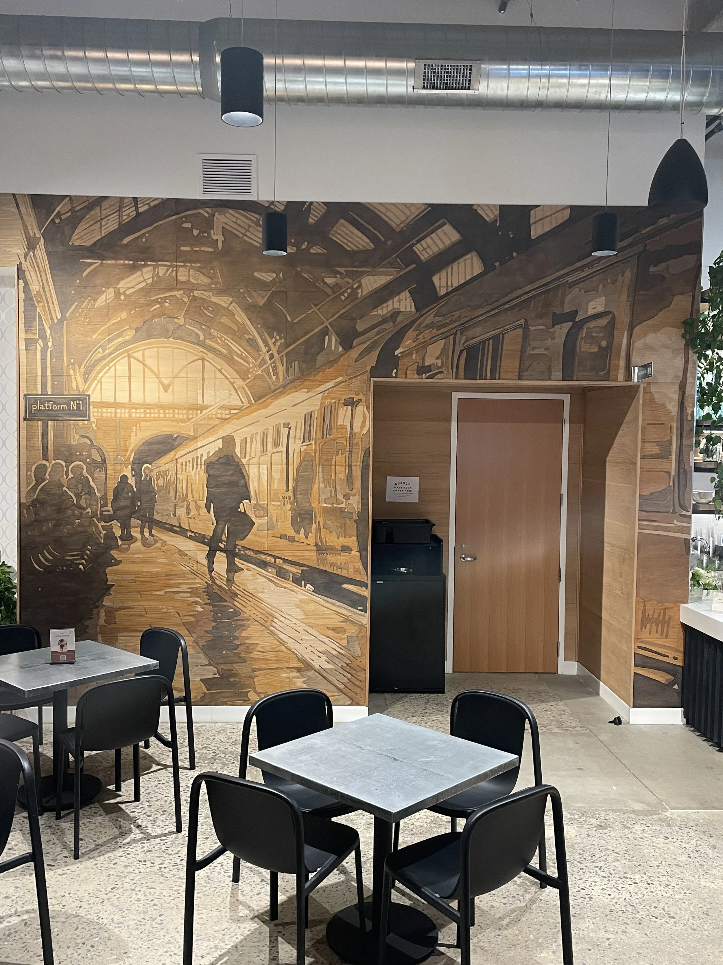 Esther Moorehead partnered with Platform Coffee in West Charlotte to create a mural for the rebrand launch of their coffee shop. The mural, painted on wood panels, combines straight espresso with two tones of diluted acrylic paint to achieve a rich, nuanced appearance. Esther’s artwork was featured in ArtPop’s Cities Program Class of 2023 and our Inspiration Projects division.