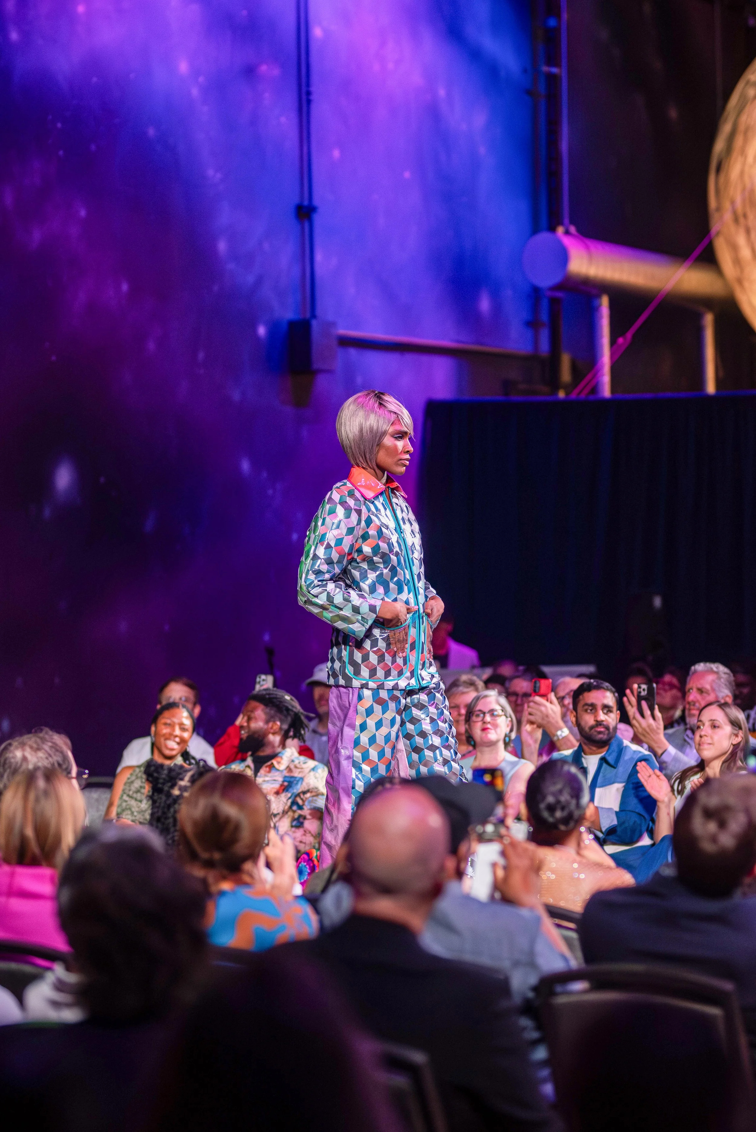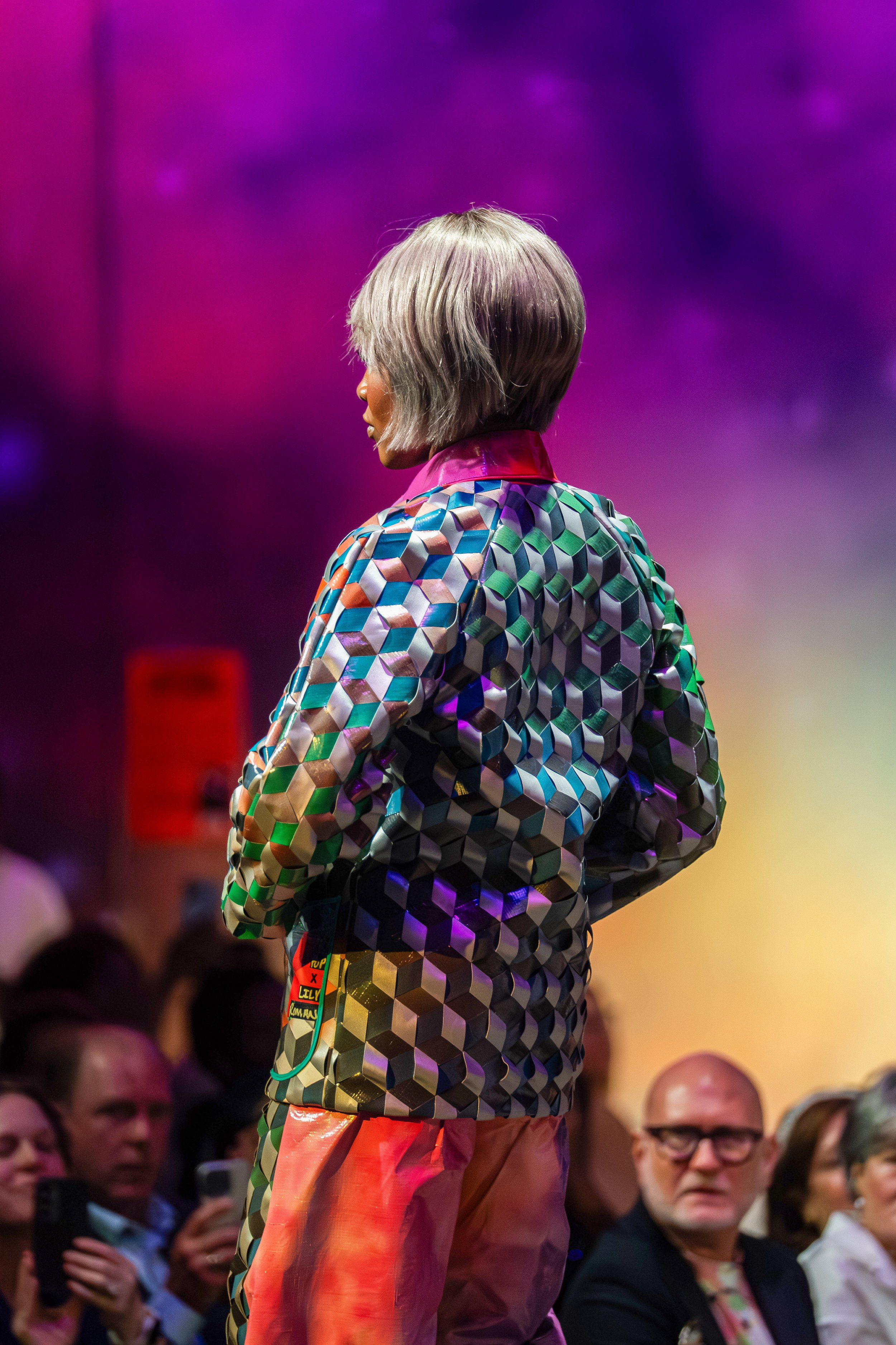 Anise’s piece plays with perception and form, exploring the concept of illusion through an intricate technique known as triaxial weaving—where three sets of vinyl strips are interlaced at 60-degree angles to create a bold 3D cube effect. The result is a visually dynamic textile that adds energy and movement to the garment.