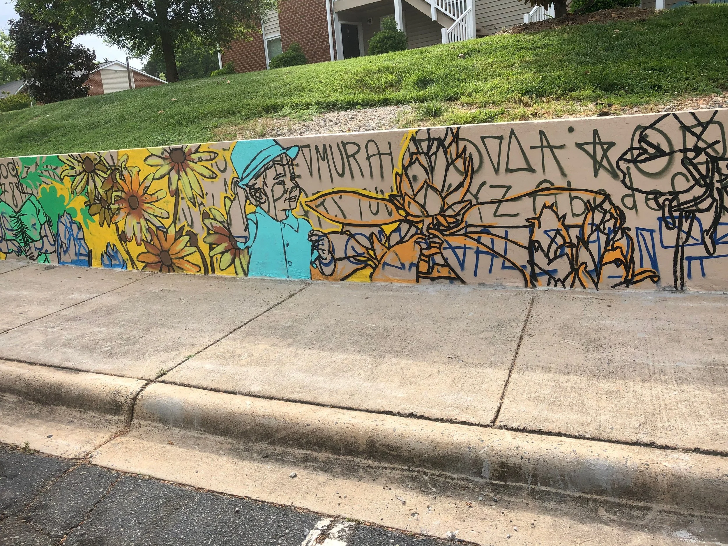 One of the NOAH areas overseen by Ascent Housing is Lake Mist, a 144-unit apartment complex immediately adjacent to the LYNX Archdale Station in the Montclaire South neighborhood. Aiming to spruce up the long, utilitarian retaining wall running alongside the complex’s entrance, the Ascent Housing team reached out to ArtPop Street Gallery to commission a mural through our Inspiration Projects division!