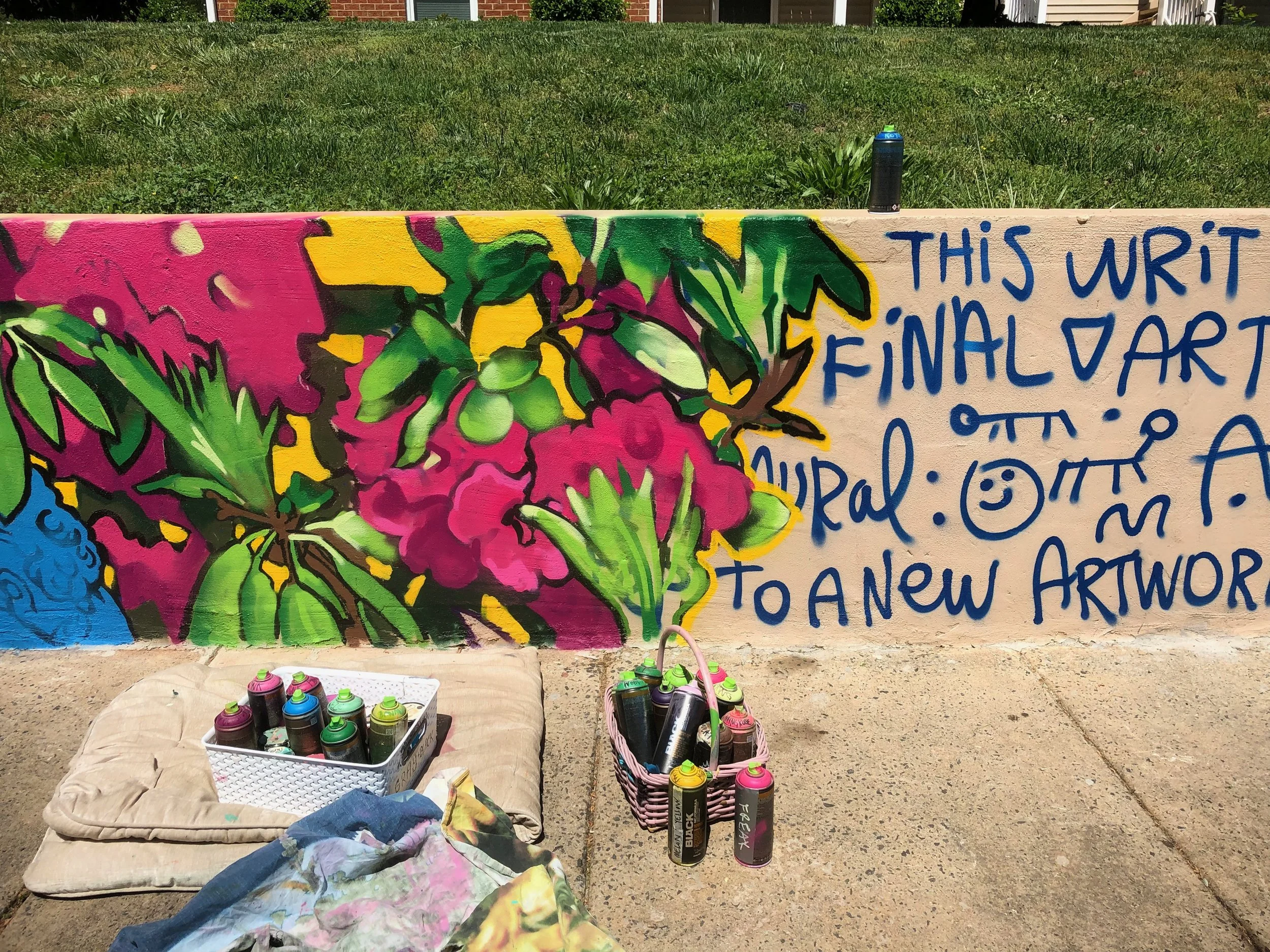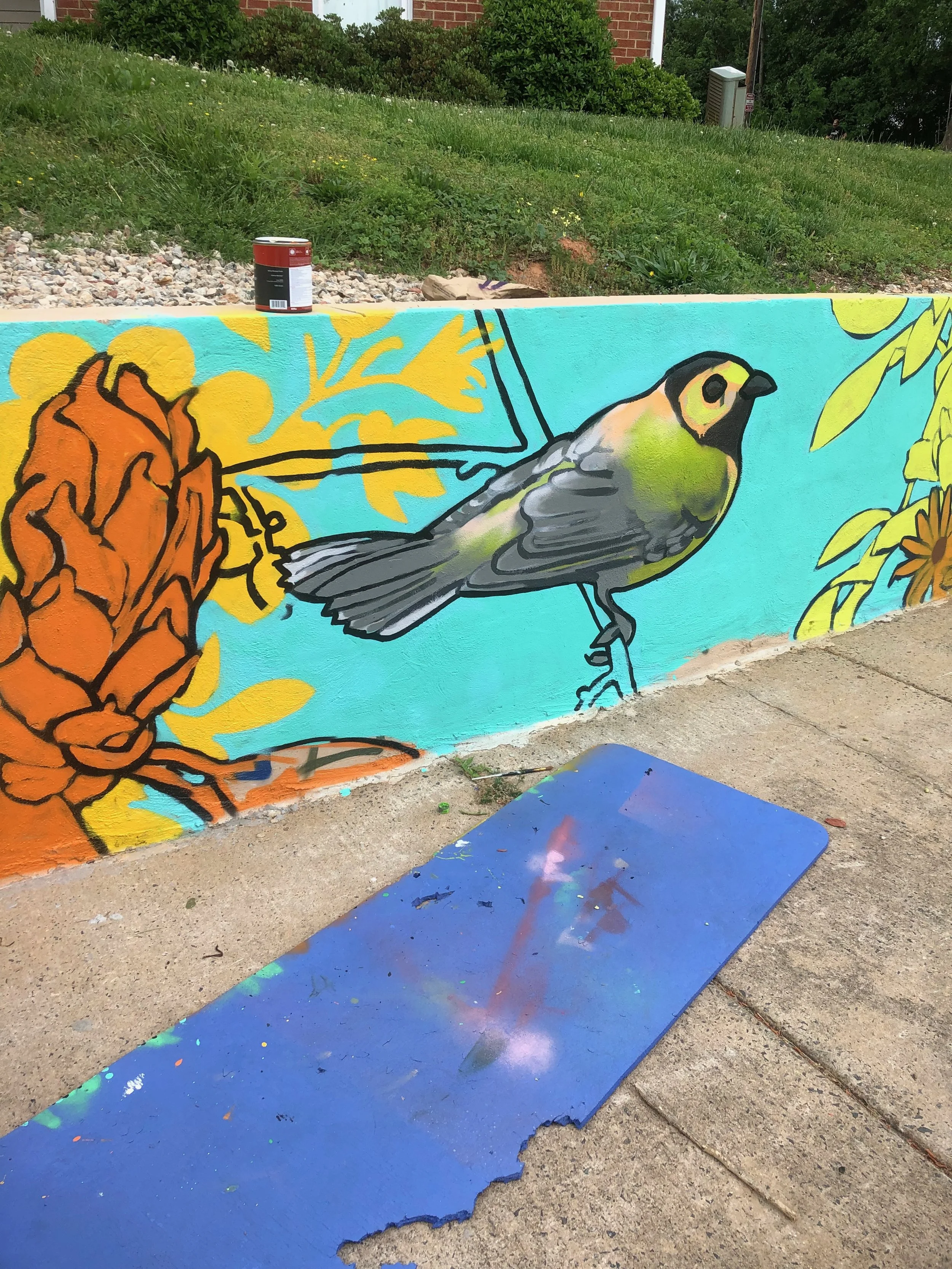 With her artwork designed and approved by the Ascent Housing team, it was time for Liz to begin her favorite part: putting paint on the wall! Working in the early mornings and late afternoons in order to dodge the intense sunlight of a warm Carolina Springtime, it took Liz just over a month to fully paint her artwork onto the 625 sq. ft. wall! While painting the mural, Liz met and connected with many Lake Mist residents as they would pass by the wall, passing along encouragement and complimenting her progress!