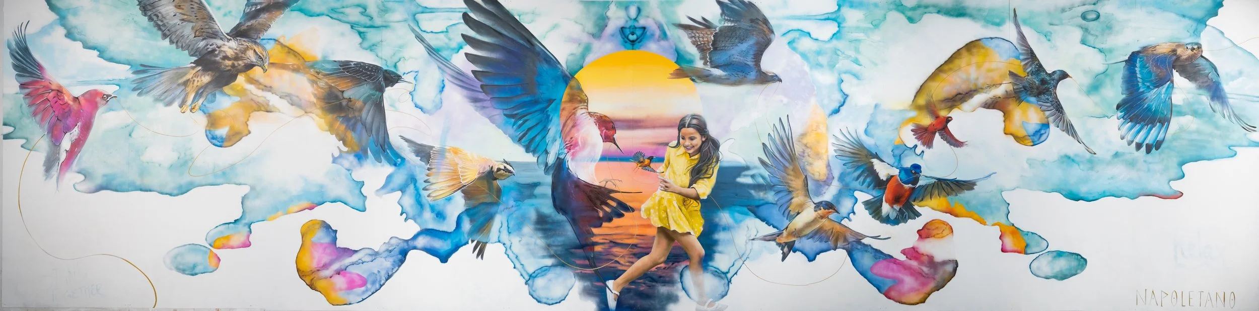 ArtPop partnered with Nick Napoletano to create this whimsical mural titled ‘Fly Away Home’ for JLL’s new Charlotte office. The JLL team joined into the mural process - not only in the inspiration that brought Nick’s work to life - but also in laying the foundation of the mural by creating the mural ‘doodle grid’ - individually spray painting words and phrases that inspire them and inspire togetherness.
