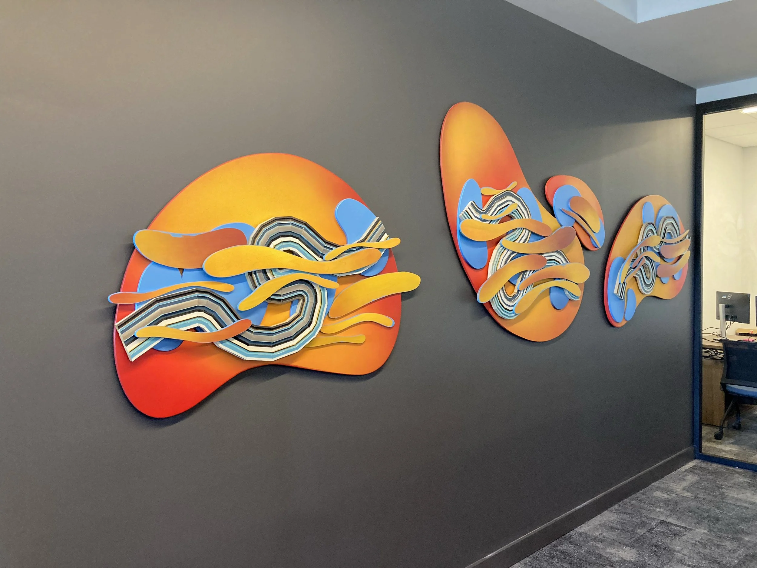 To further elevate their beautiful new educational facility in Uptown Charlotte, the UNC Kenan-Flagler Business School commissioned ArtPop Inspiration Projects to manage the creation and installation of two unique artworks by local artists! ArtPop provided artist recommendations from its extensive network of local creatives, from which the client selected two Cities Program alum: Stella Pitre (Class of 2018) and Ian Wegener (Class of 2020).