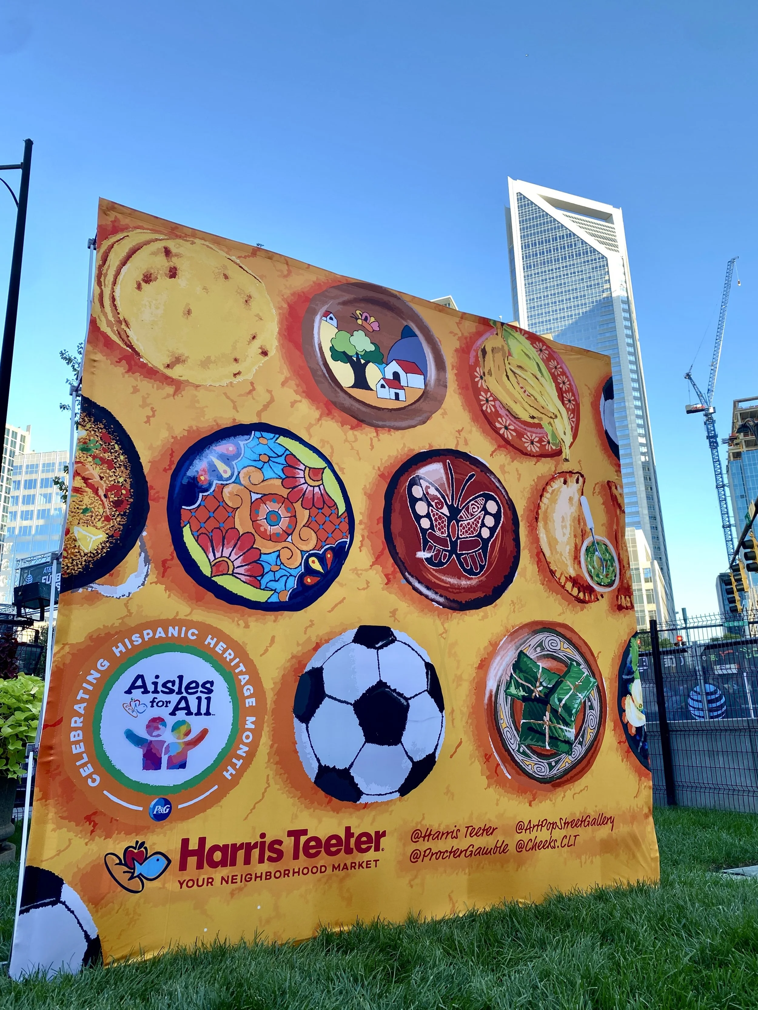 Local artist Cheeks was commissioned to create the ultimate photo backdrop for th Futbol Fiesta Fan Fest at Bank of America Stadium, ahead of the epic Mexico vs. Ghana match! As over 60,000 fans turned out in droves for the match, Harris Teeter, Proctor & Gamble, and ArtPop Street Gallery combined to create a fan experience celebrating “food, family y futbol!”
