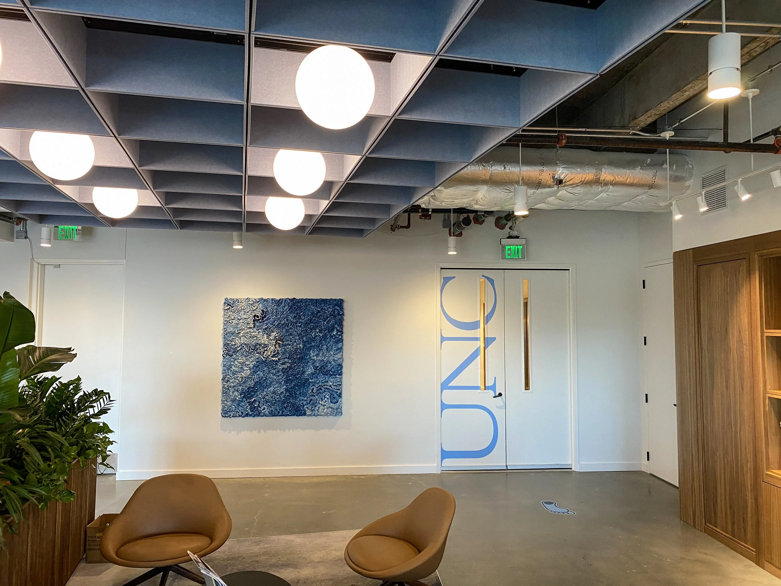 To further elevate their beautiful new educational facility in Uptown Charlotte, the UNC Kenan-Flagler Business School commissioned ArtPop Inspiration Projects to manage the creation and installation of two unique artworks by local artists! ArtPop provided artist recommendations from its extensive network of local creatives, from which the client selected two Cities Program alum: Stella Pitre (Class of 2018) and Ian Wegener (Class of 2020).